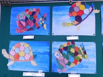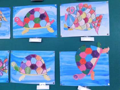 初めて絵の具を使った作品です。1色で海、2色を混ぜて自分で色を作り、魚や亀に色を塗りました。