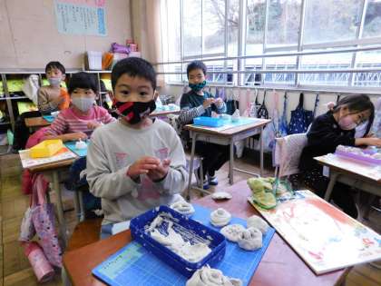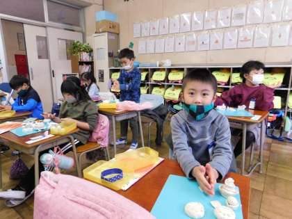 なにやら、粘土でごちそうを作っているようですよ。