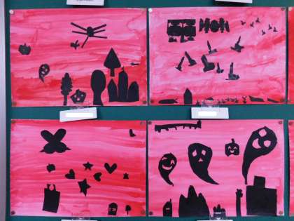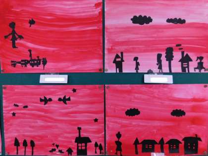 夕焼けを背景に、折り紙の黒を使い、シルエットを出します。