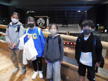 エスカレーターを降りると、日本橋のレプリカがあり、江戸の町にタイムスリップします。まずは、グループごとの写真を一枚。