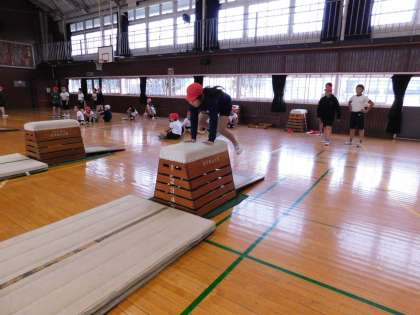 台上前転のスモールステップの練習です。跳び箱の上に足を乗せます。