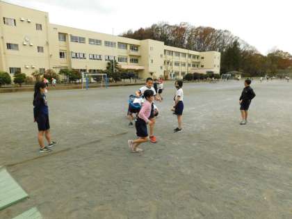 写真は陸上クラブです。寒い日でしたが、駅伝大会をしていました。校庭を大きく2周(1kmぐらい)して、タスキを受け渡していました。城小駅伝です。