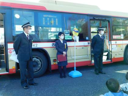 1組と2組に分かれ、見学しました。1組は川町車庫で、バスの乗り方を教わりました。
