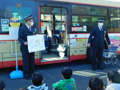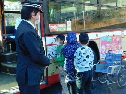 バスの乗り口にあるマイクで運短手さんと会話ができます。代表の子がさっそく体験させていただきました。