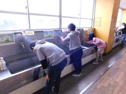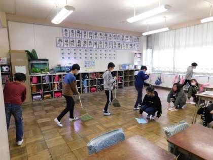 5年生が教室掃除をしています。流しでは4年生が冷たい水を我慢して掃除してくれています。