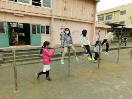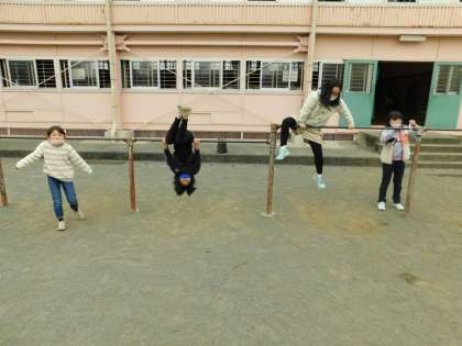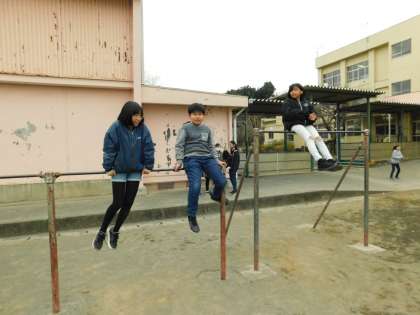 12日の昼休みです。外は小雪が舞っていましたが、子供たちは元気に遊んでいました。鉄棒の冷たさも何のそのです。