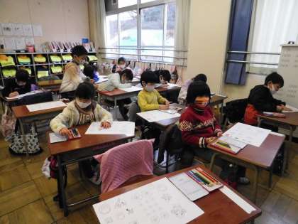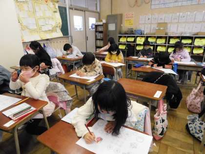 1年1組では、校内書初め展に使う台紙の飾りを、色塗りしていました。上手に塗れたかな。