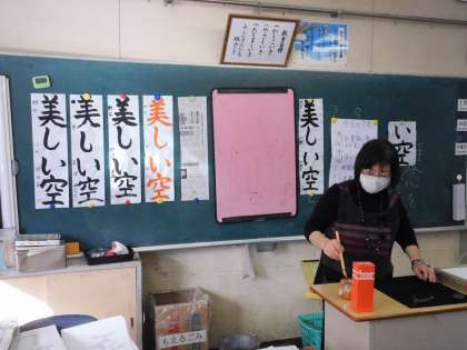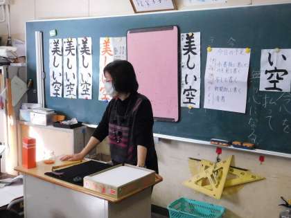 4年2組では書初めの授業の最中です。まずは先生がお手本を書いてくれます。