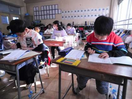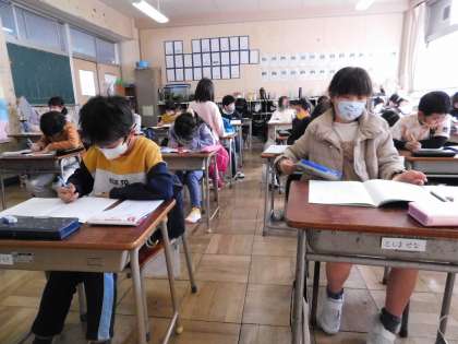 2年2組は教室で、算数ドリルに取り組んでいました。みんな集中しています。ミニ先生もいますね。