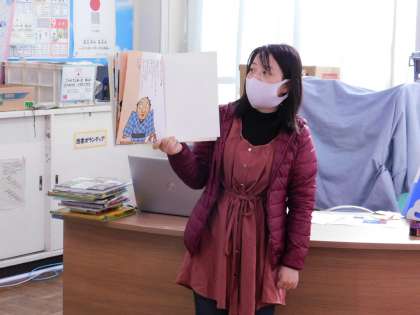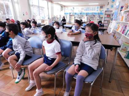 1年1組は図書の時間でした。司書の先生が落語の本を読んでくれました。1年生には少し難しい部分もありましたが、大人(私)は大笑いして聞いていました。