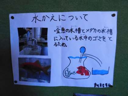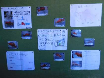 飼育・栽培員の子供たちが、普段お世話をしている金魚についてまとめたものを、理科室前の掲示板に貼ってくれています。