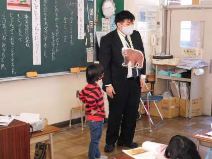 オオカミ役になり、クマと出会った時のオオカミの気持ちを考えています。