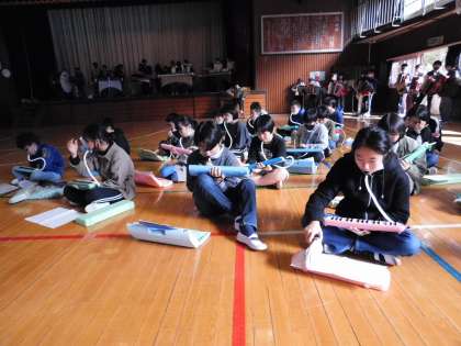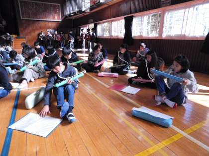 6年生が「6年生を送る会」で披露する合奏曲の合同練習を開始しました。
