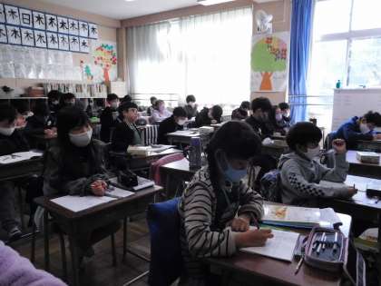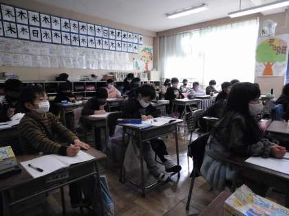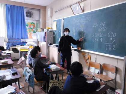 3年生の算数授業風景です。2ケタ×2ケタのかけ算の解き方を、みんなで考えていました。