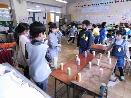 折り紙の手裏剣を使って、机に立てた筒を倒します。これがなかなか難しいです。