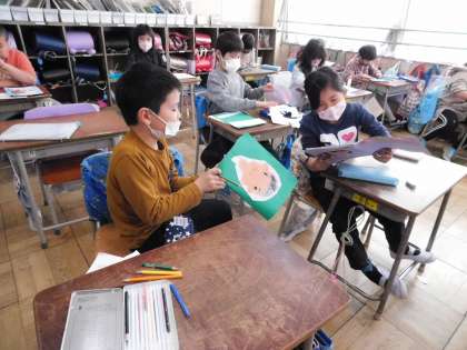 出来上がったところまで、友達と見せ合いっこ。たのしそうにしています。