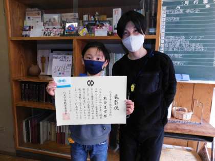 2年2組の男の子が、モトクロス全国大会で4位になりました。教育委員会から表彰状が届き、先生と一緒に、ハイ、ポーズ! 記念写真を撮りました。