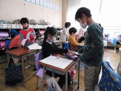 2年1組も、算数プリントに挑戦中でした。終わった子は先生に丸つけをしてもらっています。