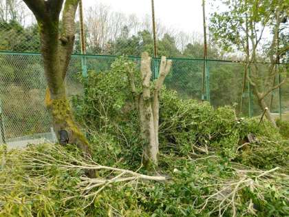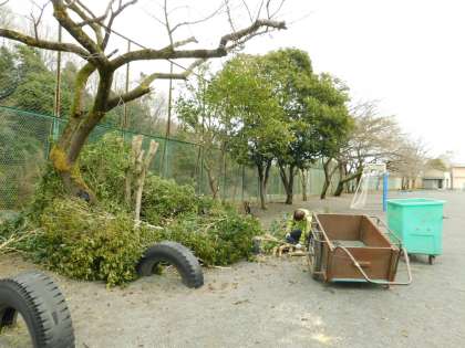 校庭フェンスに覆いかぶさっていた金木犀の木を、用務主事さんが次々と剪定してくれています。これで、桜の花もきれいに見ることができます。