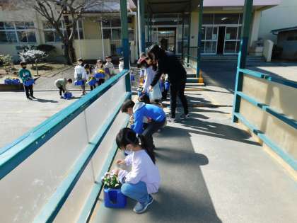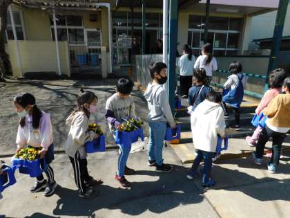 お世話になって6年生のために、1年生が育てたパンジーを飾りに来てくれました。