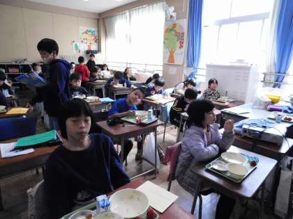 写真は3年1組です。もう食べ終わっている子もいて、配りものをしてくれていました。準備が早かったのですね。