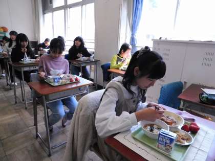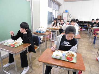 写真は6年3組です。6年生は小学校最後の給食です。味わって食べてます。