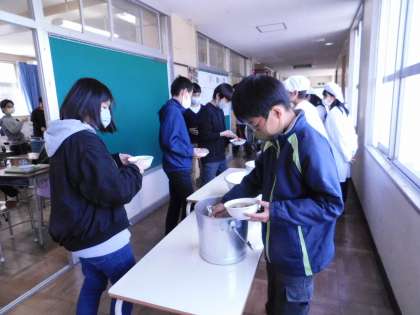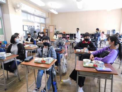 写真は6年2組です。練習で、給食の準備が今始まりました。