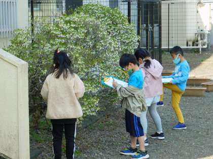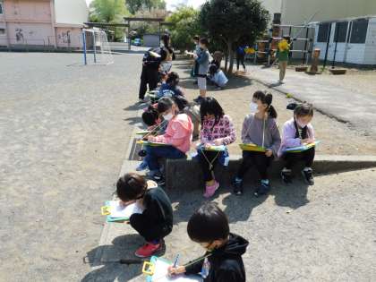 2年生が生活科の学習で、春を見つけに校庭に出ていました。