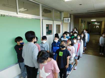 3年生が、教室以外の分担掃除場所の確認に出かけました。先生から説明を受けています。