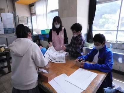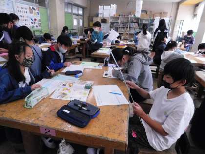木材を使って、箱を作るようです。イメージ図と形や大きさを考え、木取り図に記入していました。先生からのアドバイスももらっています。