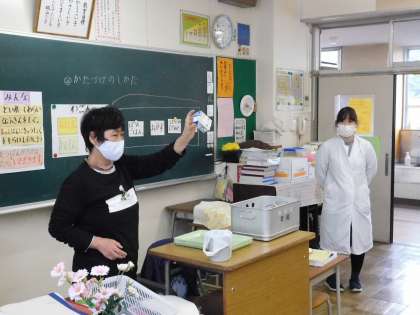 学校では牛乳パックを開いて乾かし、リサイクルに回しています。1年生も牛乳パックの開き方を学びました。