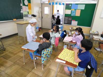 4月14日(水)1年生が初めての給食を食べました。牛乳配り担当の子も上手に配っていますね。