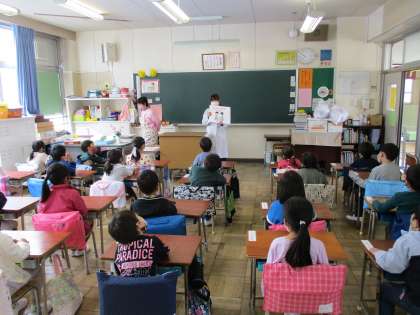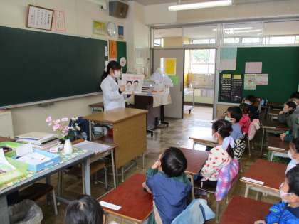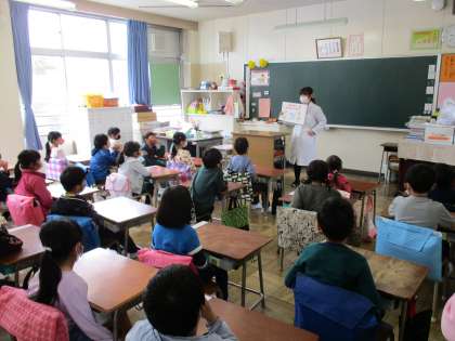 まず「1年生給食が始まります」の紙芝居を読みました。