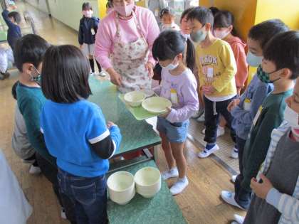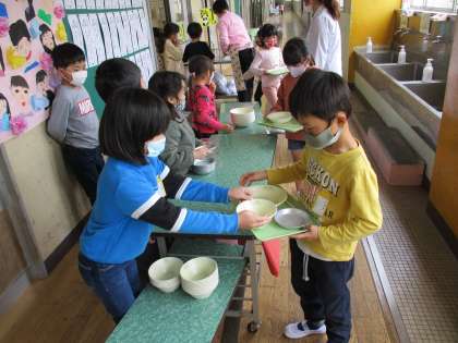 実際におぼんとお皿を使って給食をもらうシミュレーション