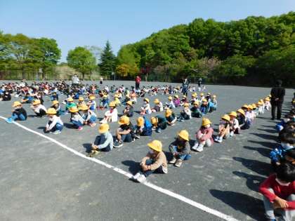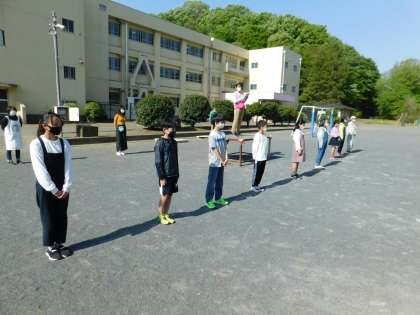 19日朝、校庭で「委員会紹介集会」を行いました。1年生が集会デビューです。