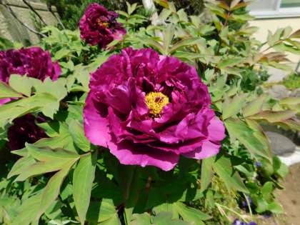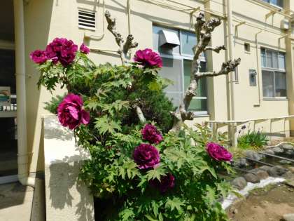 今年も職員玄関前の牡丹の花が咲きました。見事な大きさです。