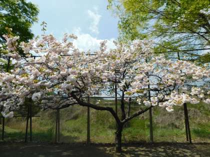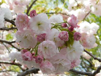 今は最後に咲く八重桜が満開です。こちらの木は白色が多い八重桜です。