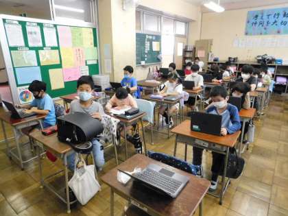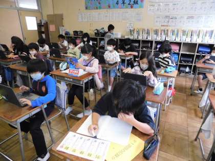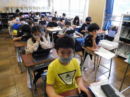 4年2組は朝からタブレットパソコンを出して、何やら操作中です。