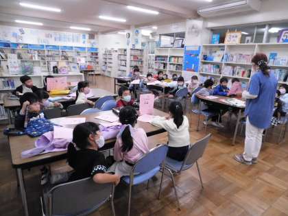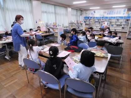 1年生の図書の時間です。講師の先生が担当してくれています。