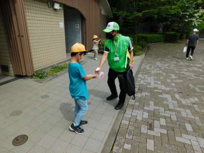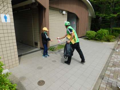 まずはトイレ休憩です。学校コーディネータの方が消毒液を掛けてくれています。