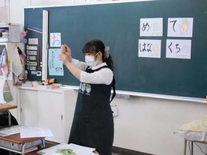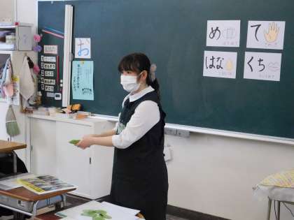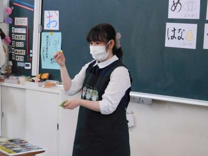 まずは、栄養士の先生から、むき方の説明を聞きます。