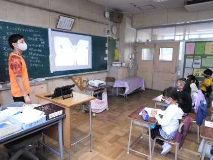 3年1組は理科の授業中です。モンシロチョウのからだのつくりを勉強していました。