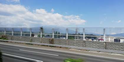 最初の見学先、久能山に向けて、出発しました。富士山は、上の方に雲が掛かってきました。