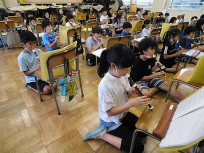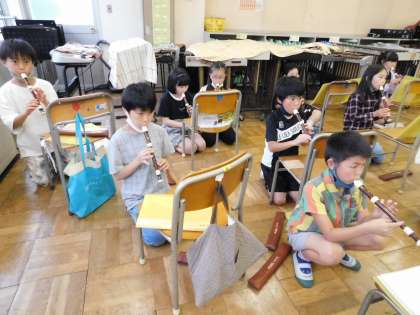 4年2組が音楽の授業でリコーダーを吹いていました。