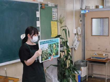 7月5日、3年生がトウモロコシの皮むき体験(食育)をしました。まずは、栄養士の先生から、トウモロコシについて、いろいろと教えてもらいました。
