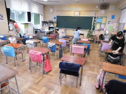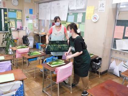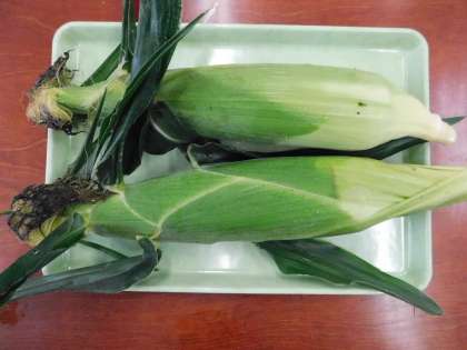 子供たちが手を洗いに行っている間に、栄養士さんとサポーターの先生が、机上の消毒と、一人2本分のトウモロコシを準備しています。