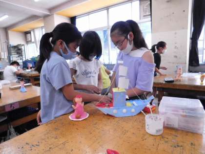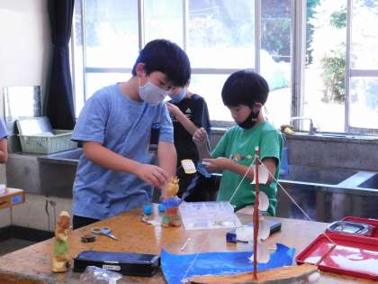 完成した船と船乗りの人形を合体させます。みんな満足そうな笑顔でした。