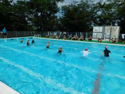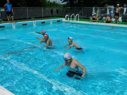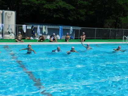 7月20日、6年生が着衣泳を行いました。まずは全員で水慣れです。