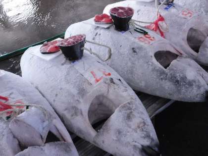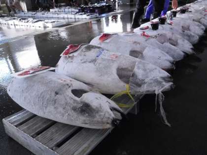 セリが始まる前に、今日セリに出される魚の種類を教えていただきました。冷凍のマグロも並んでいました。