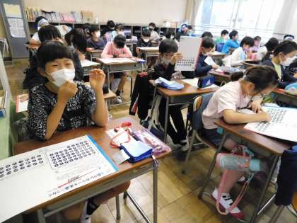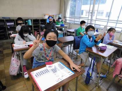 遮光版に載っている各競技のピクトグラムをみんなで確認しています。